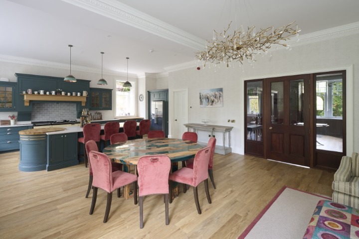 Internally, the reinstated wing provides contemporary kitchen and dining accommodation with supporting spaces at ground floor and additional rooms above. Existing openings were reinstated where possible, allowing the extension to reconnect naturally with the original plan form while supporting modern family living.