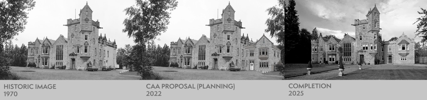 Set within mature woodland south of Inverness, the house is defined by its crowstepped gables, corbelled detailing and a distinctive four-storey tower. The demolition of its original north wing in the 1960s left the building subtly unresolved; the tower appearing overly dominant and the architectural hierarchy weakened.
